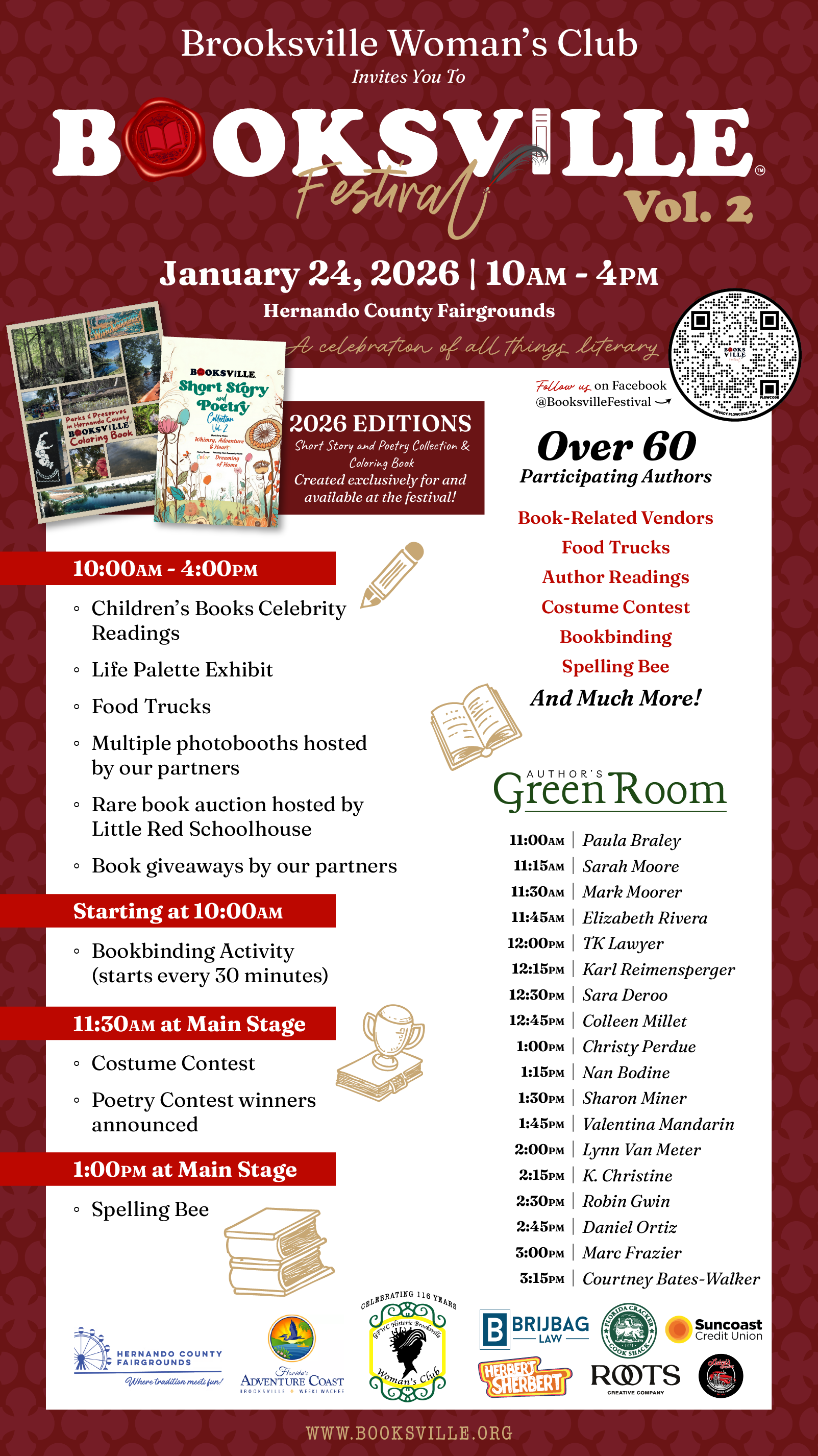 Our second-annual Booksville Festival was a huge success. We moved the event location to the Hernando County Fairgrounds and filled the space with all things literature, all day long! Attendees enjoyed author readings, free books, shopping with local authors, activities, poetry, and character and spelling bee contests.